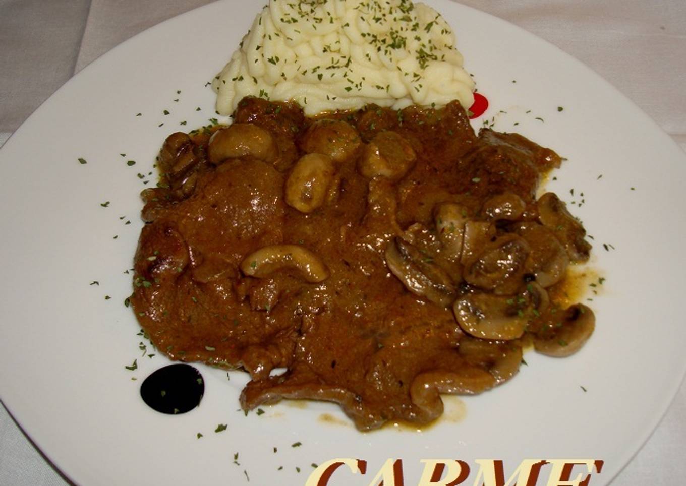- Si se desea hacer el puré hacerlo según costumbre. Emplatar dos o tres trozos de carne según tamaño por comensal, con champiñones, salsa y el puré. Servir caliente... y con pan en la mesa.