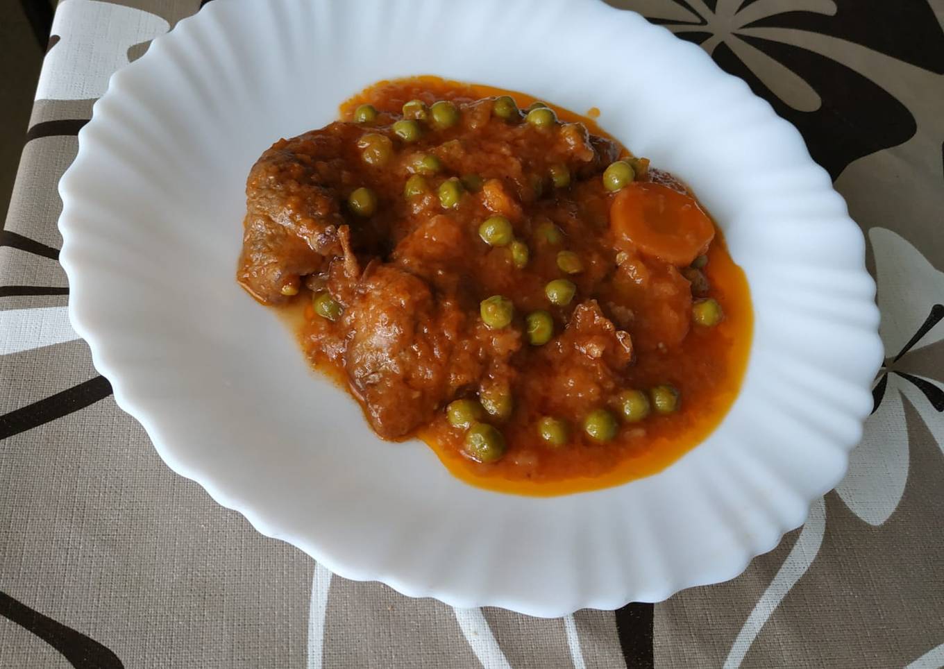 - Ahora procederemos a hacer un sofrito de cebolla con zanahorias. Una vez que esté doradito añadir el laurel y el tomate. Por último echar la copa de vino y un vaso de agua con los guisantes y la carne. todo este proceso tarda unos 20 minutos. Pasado este tiempo podéis añadir los moixernons 🍄escurridos de agua, que hierva a fuego lento unos 10 minutos, vigilando que no se pegue la salsa. «««Añadir un poquito más de agua si ves que se queda muy espeso y sal.