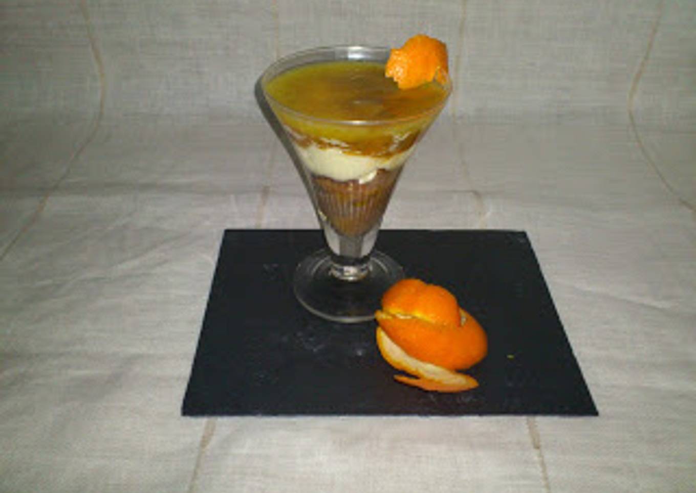 - Para las copas poner unos trozos del bizcocho empapado en chocolate encima el queso con el azúcar, los taquitos de mango y la gelatina de naranja coronando.