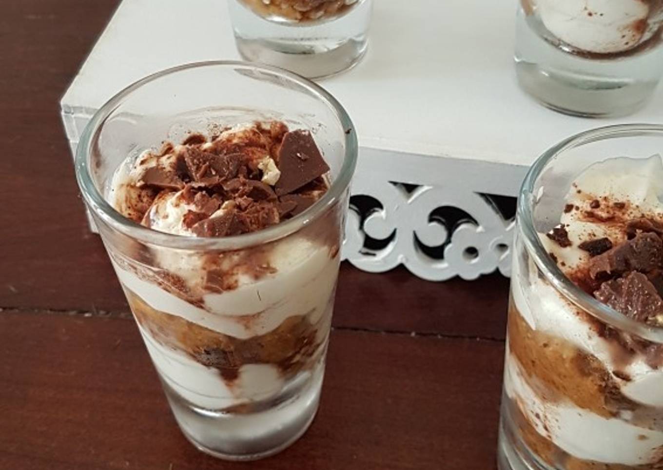- En un chupito desmenuzar las vainillas mojadas en café luego colocar la crema con el queso, espolvorear cacao. Nuevamente colocar vainillas, crema con queso, cacao