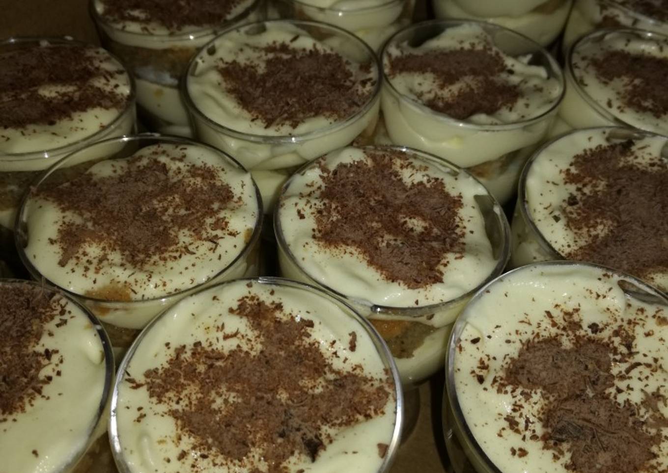 - Ahora en una fuente o en vasitos, yo en esta ocasión lo realize en vasitos para un cumple. Vamos humedeciendo las vainillas en el café y acomodando en la fuente una capa de vainillas (vertical) y arriba nuestra crema otra vez vainilla pero está vez en otra forma(horizontal) luego crema, así tantas veces sea necesario arriba tiene que quedarnos con crema donde rallamos chocolate o agregamos cacao.