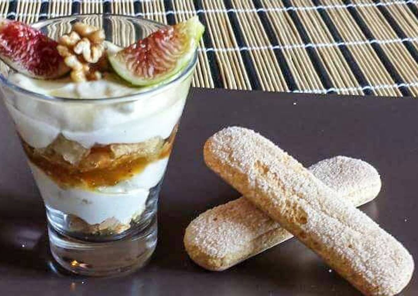 - Ahora preparamos un jarabe para mojar las galletas. Ponemos en un cazo pequeño unos 50 gramos de miel y 100 ml de agua. Hervimos y dejamos enfriar. Tomamos 4 vasos bonitos y bastante grandes y empezar con un poco de galletas mojadas en el jarabe de miel, después un poco de pulpa de higos e nueces, un poco de crema con queso mascarpone, un poco de galletas mojadas, un poco de pulpa de higos y nueces y....continuar en este manera hasta llenar los vasos. Si os gusta guarnir con trozos de higos y un trozo de nueces. Guardar en frigorífico hasta a 15 minutos ante de servir el postre.