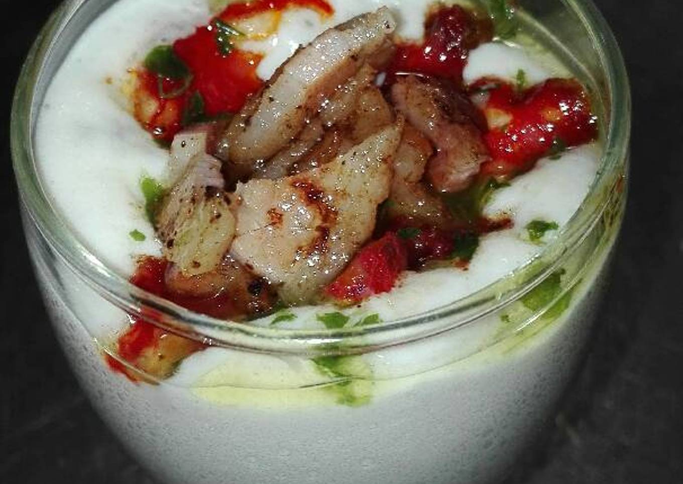 - Lo repartimos en copas o donde os guste se le echa con cuidado los taquitos que hemos preparado con cuidado que no se hundan y añadimos un poquitín de picada de ajo y perejil