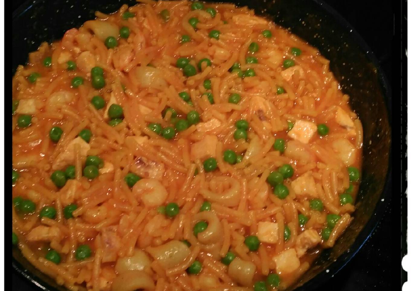 - Poner los guisantes y cuando falten unos minutos añadir el pescado y las gambas reservadas, los fideos tardan unos 10 minutos dejar hasta que absorba todo el caldo. Yo le echo un chorrito de limón y listo!!!.