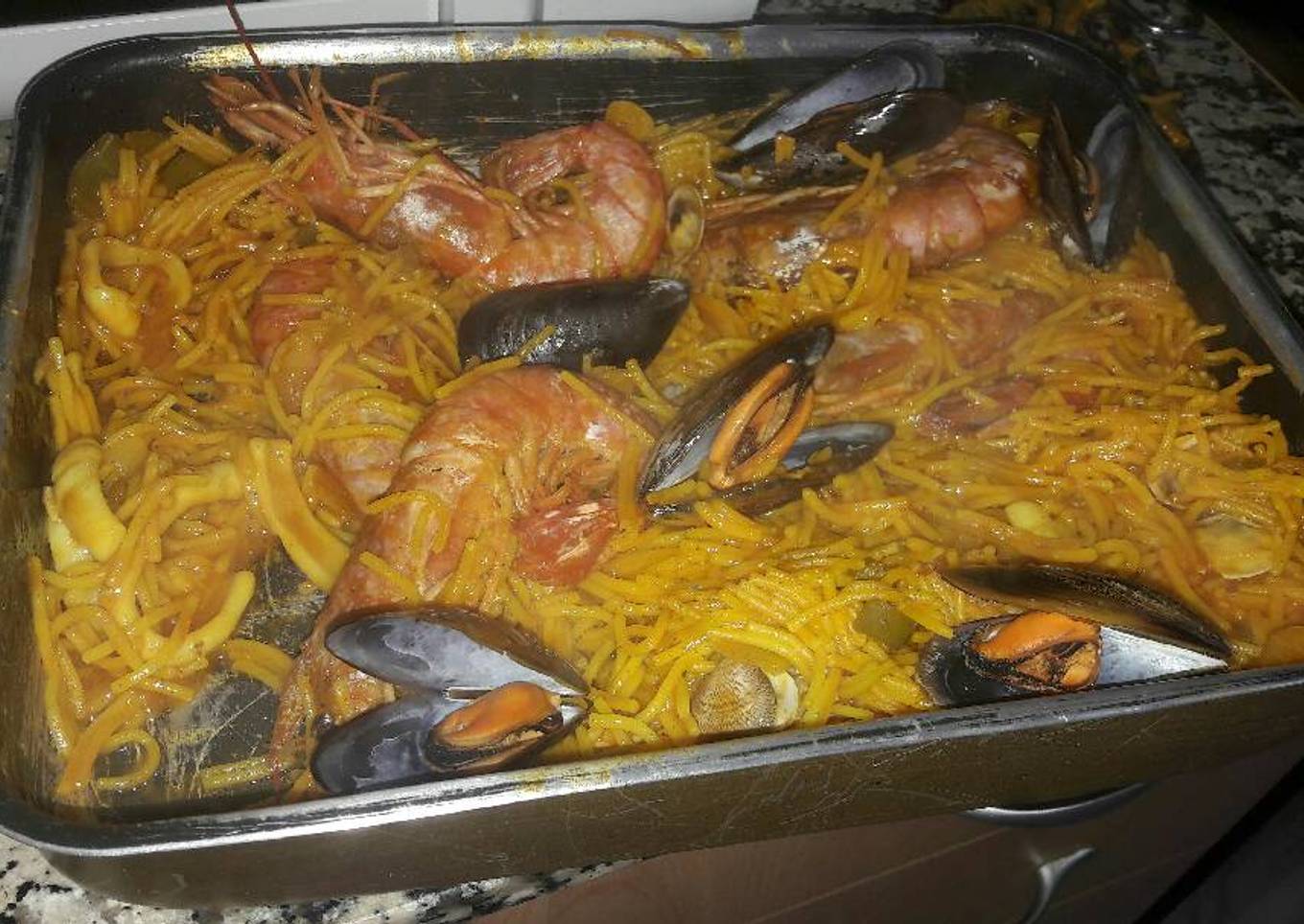 Esta fideuá la hago a mi manera ya que queda más jugosita y no tan seca a nosotros nos gusta así, en la foto no se aprecia muy bien pero sinceramente esta para chuparse los dedos!