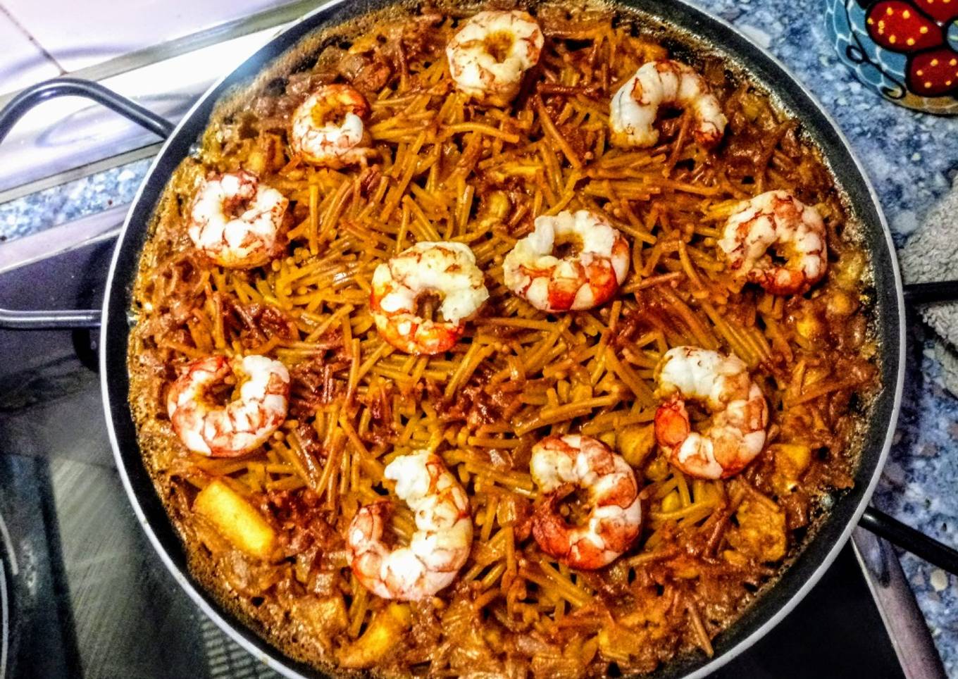 Hey everyone, hope you're having an incredible day today. Today, we're going to make a distinctive dish, Fideuá de sepia y gambones con reducción de Pedro Ximénez. One of my favorites food recipes. For mine, I'm gonna make it a bit unique. This will be really delicious.