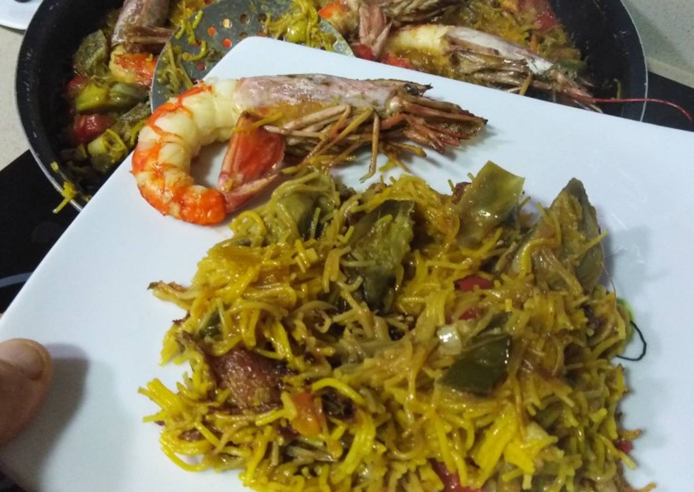 - Cuando lleven cociendose los fideos 5 minutos ponemos los gambones de decoración