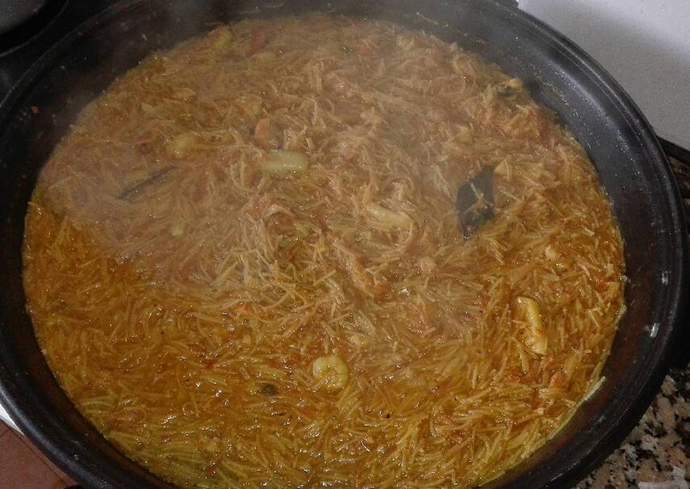 - En una sartén aparte tostaremos los fideos hasta que estén dorados, una vez dorados los añadiremos al sofrito, previamente tendremos el fumet caliente para añadirlo con los mejillones lo cubriremos, y cuando falten unos diez minutos añadimos las gambitas, para que suelten el jugo y no queden secas.