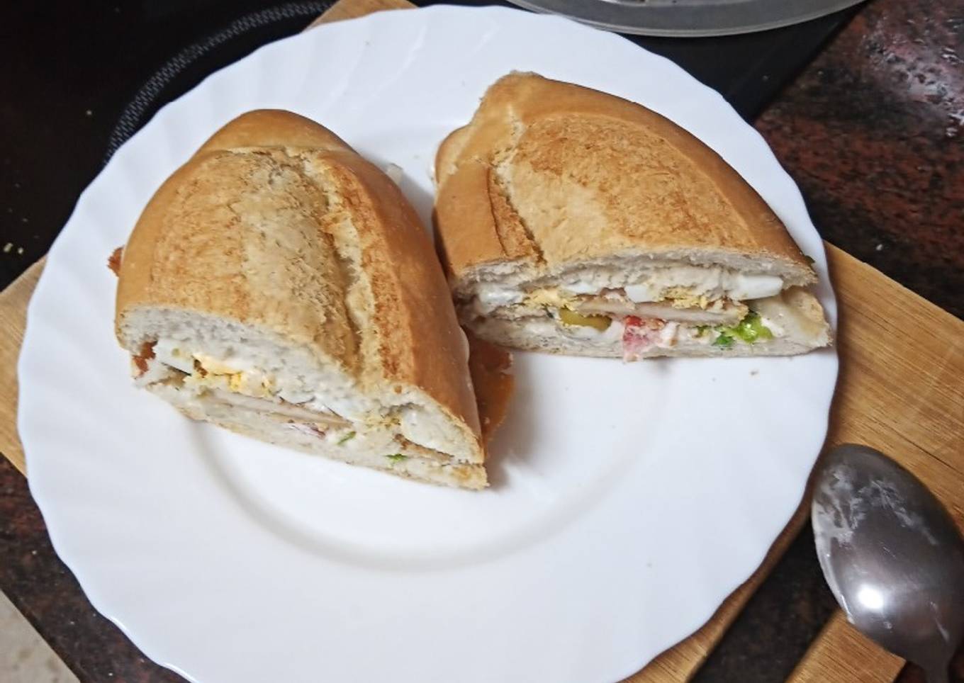Bocadillo de pechuga empanada, ensalada, huevo duro y mayonesa