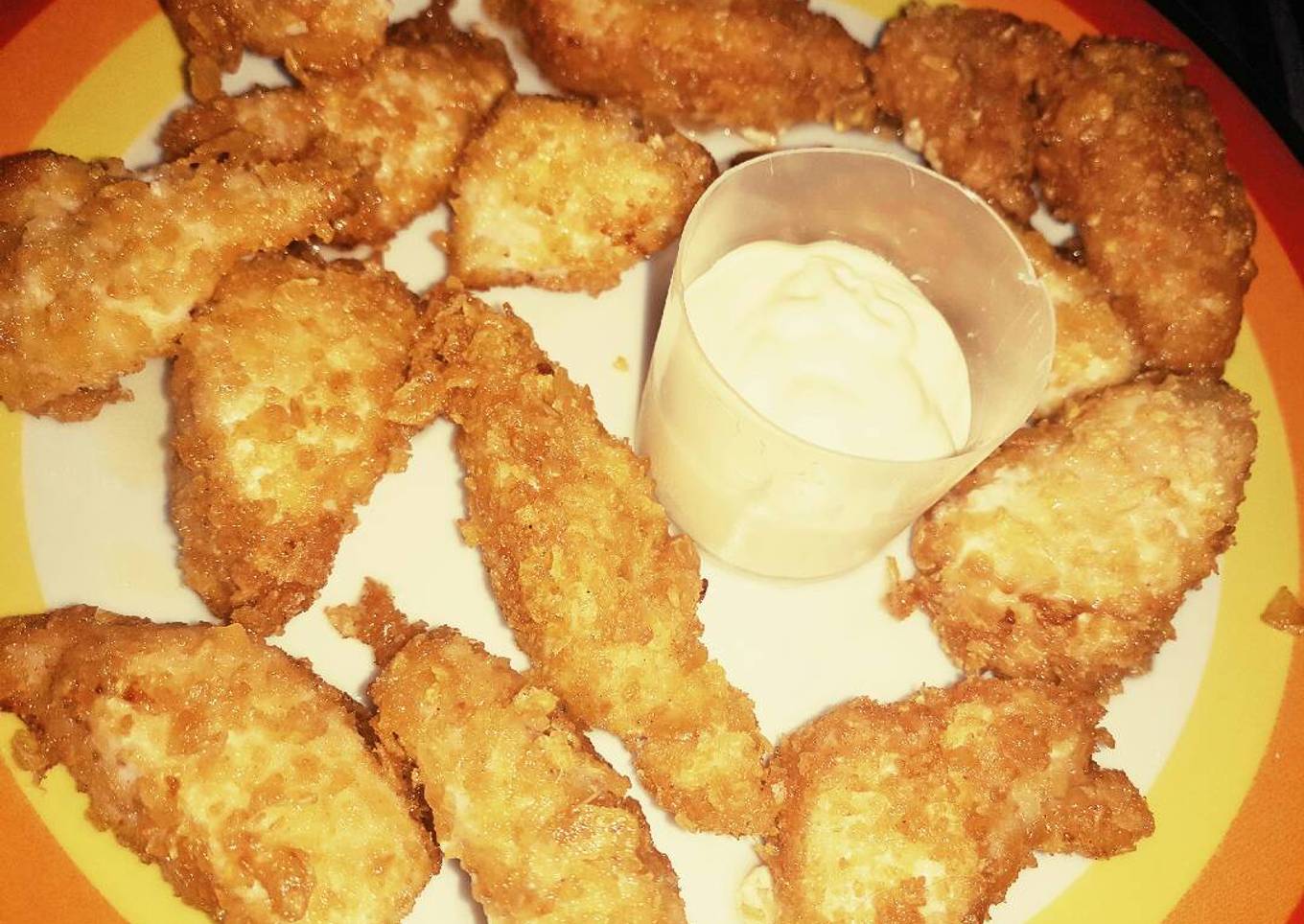 - Primero cojemos la tira de pollo y la mojamos en el huevo.