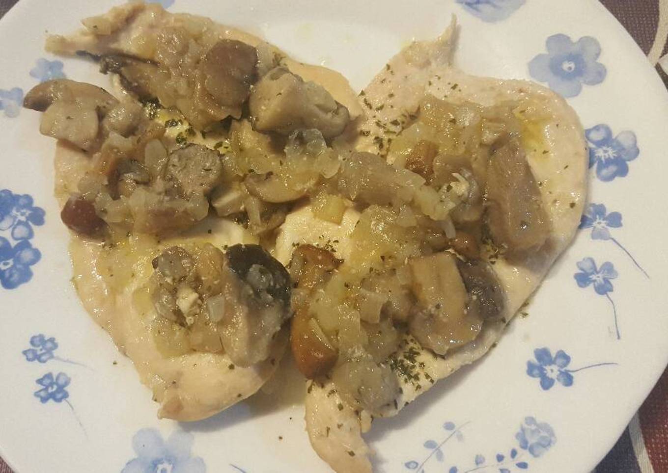 - Poner los filetes de pollo encima de la cebolla y las setas. Añadir sal, ajo y perejil en polvo. Y 5 minutos más al microondas cubriéndolo nuevamente.