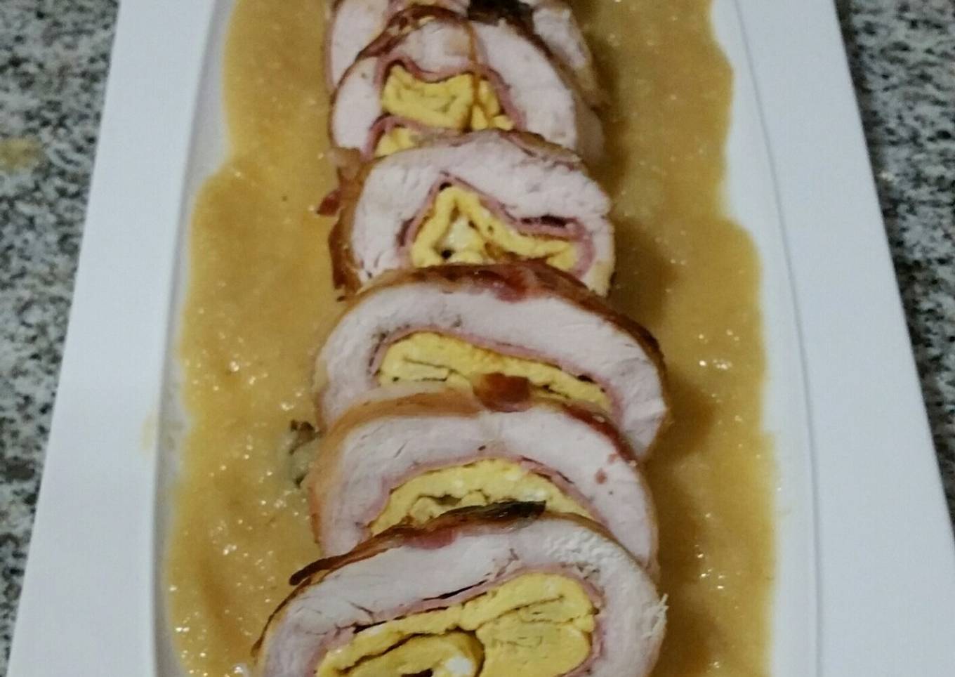 - Enrollamos las pechugas con el bacon y lo atamos con un cordón bien para evitar que se salga el relleno.
