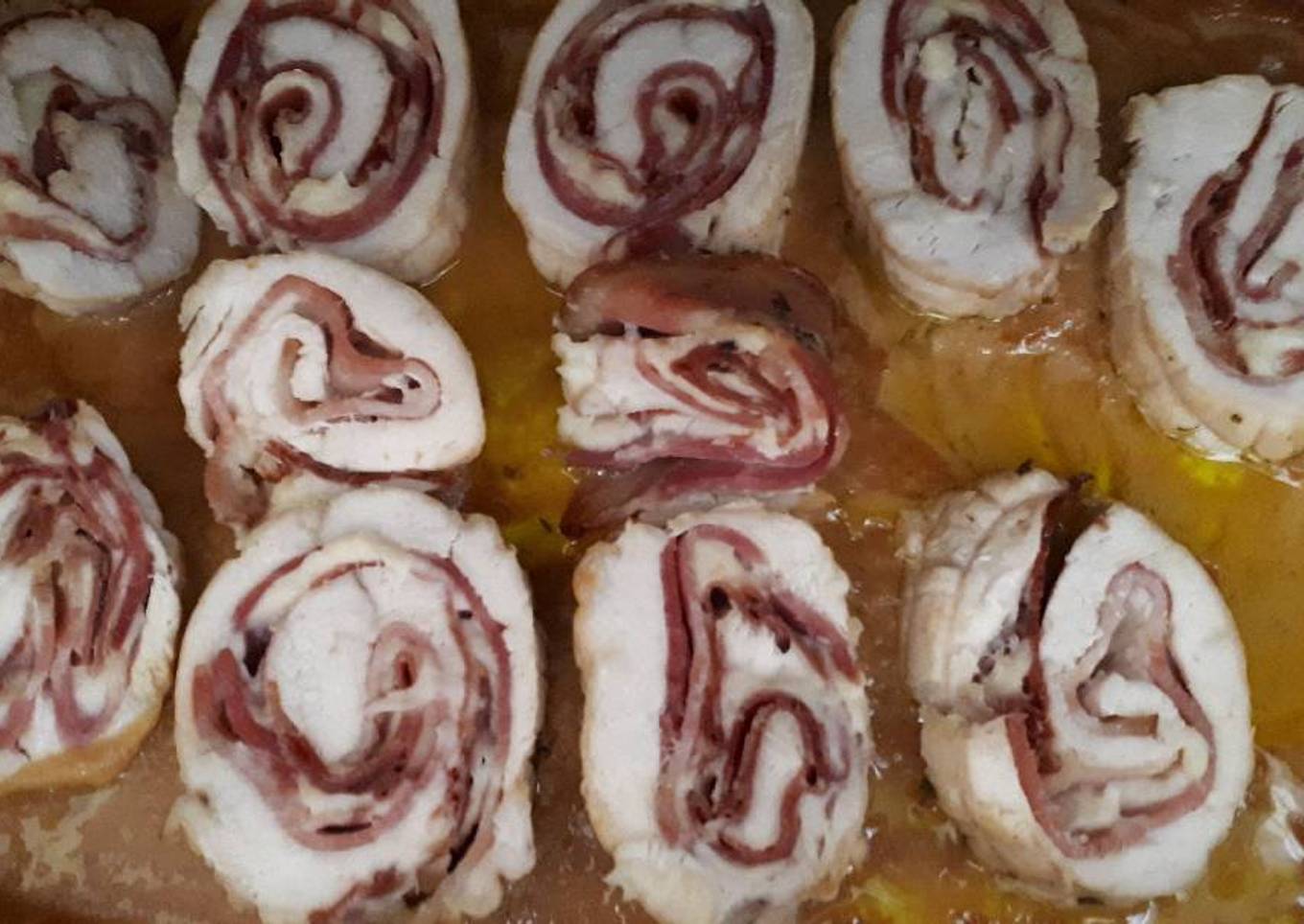 - Extender pechugas y salarlas y poner encima los filetes de bacon, los de queso y los de jamón serrano y enrollar