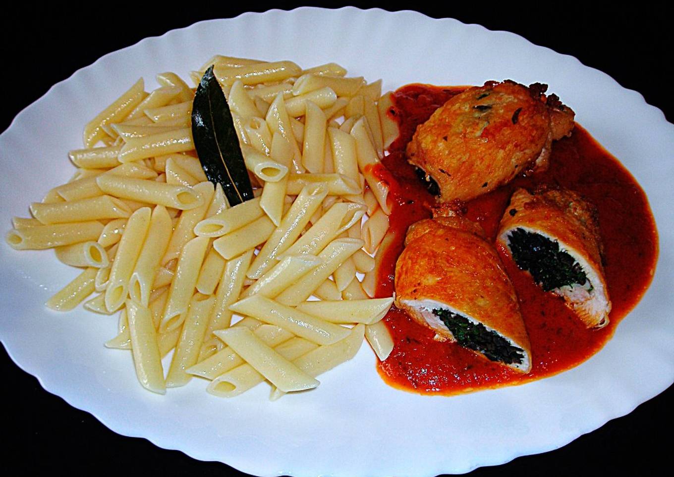 - Reparte la pasta en cuatro platos y la salsa de tomate frito. Encima de la salsa coloca los rulos de pechuga de pollo rellenos.