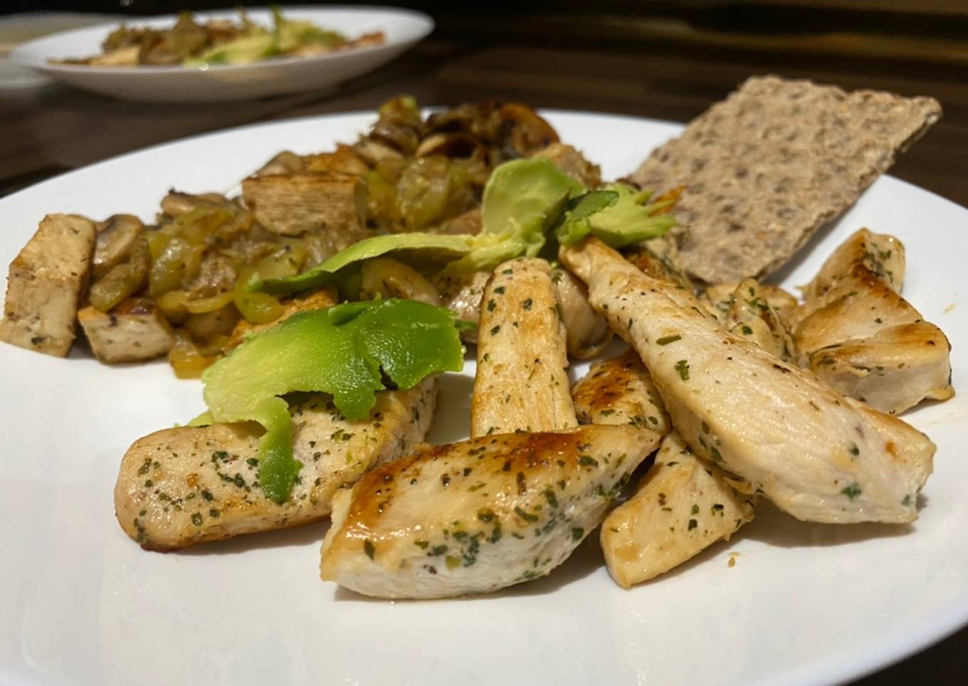 Salteado de verduras con tofu, acompañado con tiras de pollo