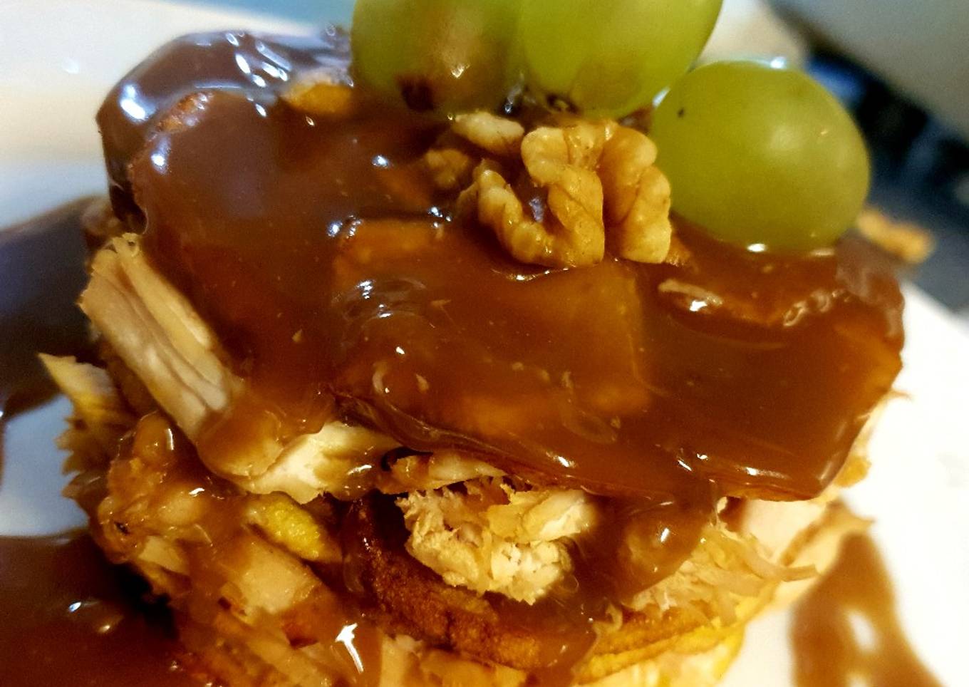 Timbal de patata y pechuga de pollo con salsa de vino tinto