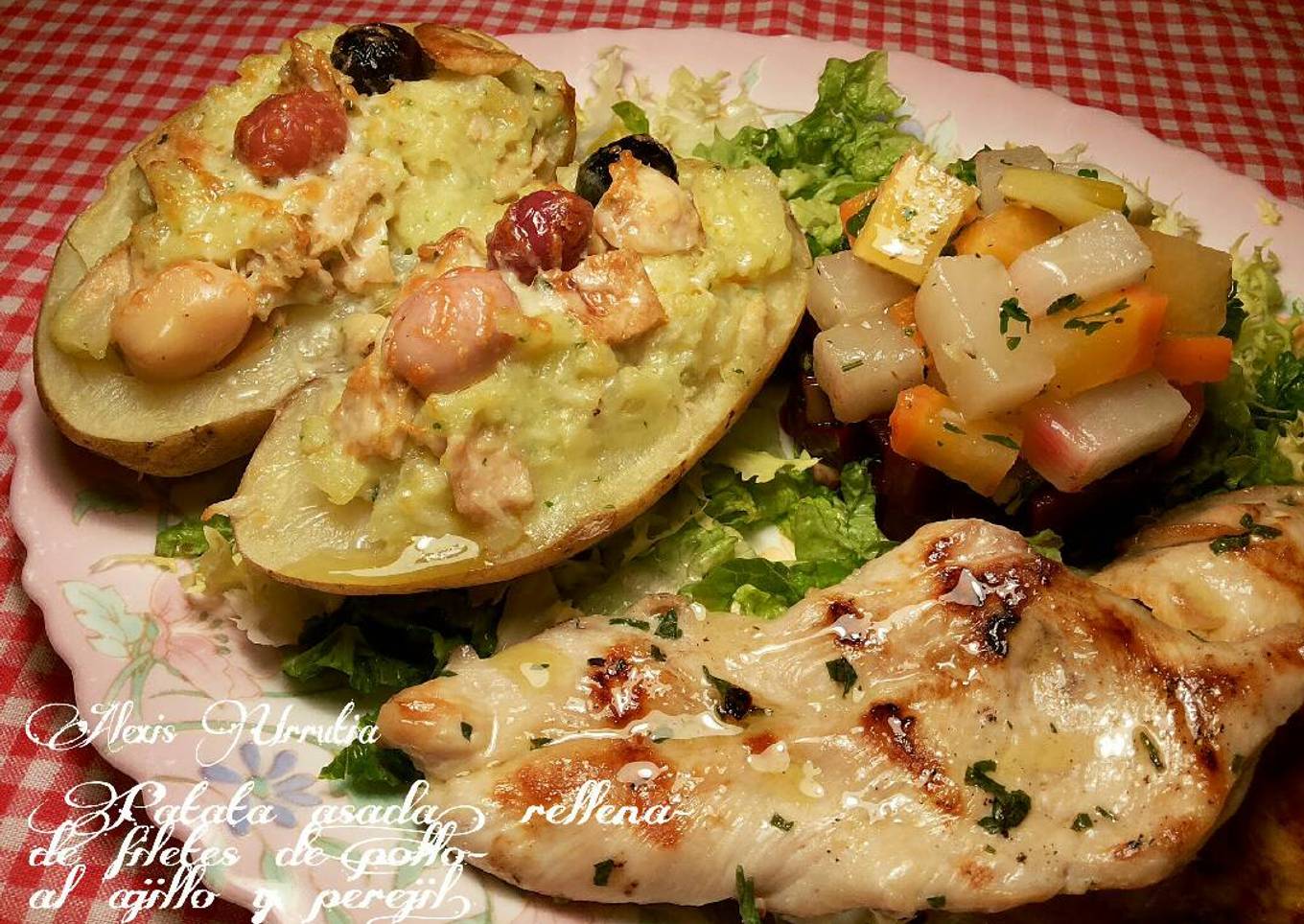 Patata asada, rellena de filetes de pollo al ajillo y perejil