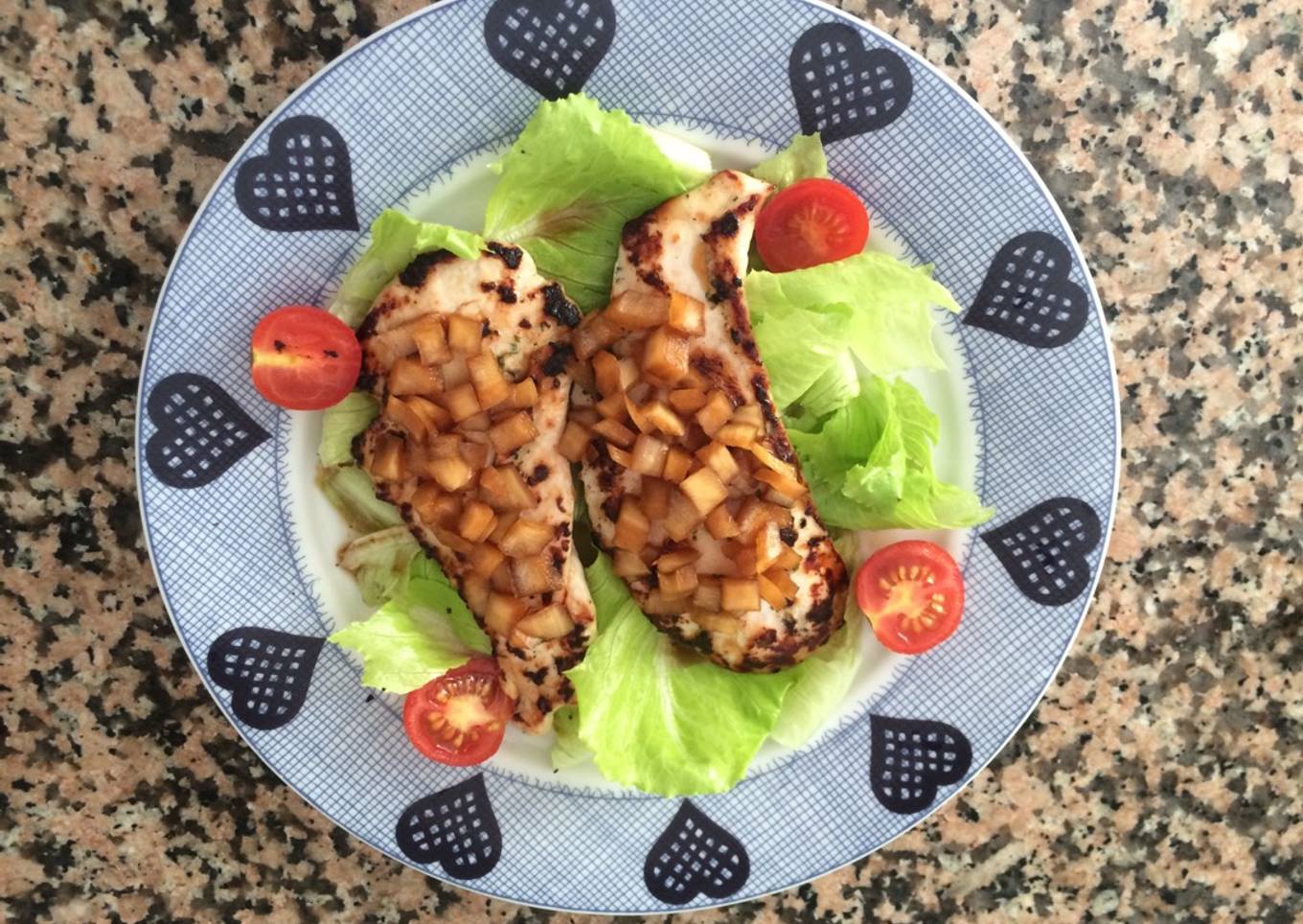 - Cuando la pechuga esté dorada la sacamos y la ponemos sobre la lechuga. Sacamos la cebolla en salsa de la nevera y la ponemos sobre la pechuga. Ya esta listo para comer.