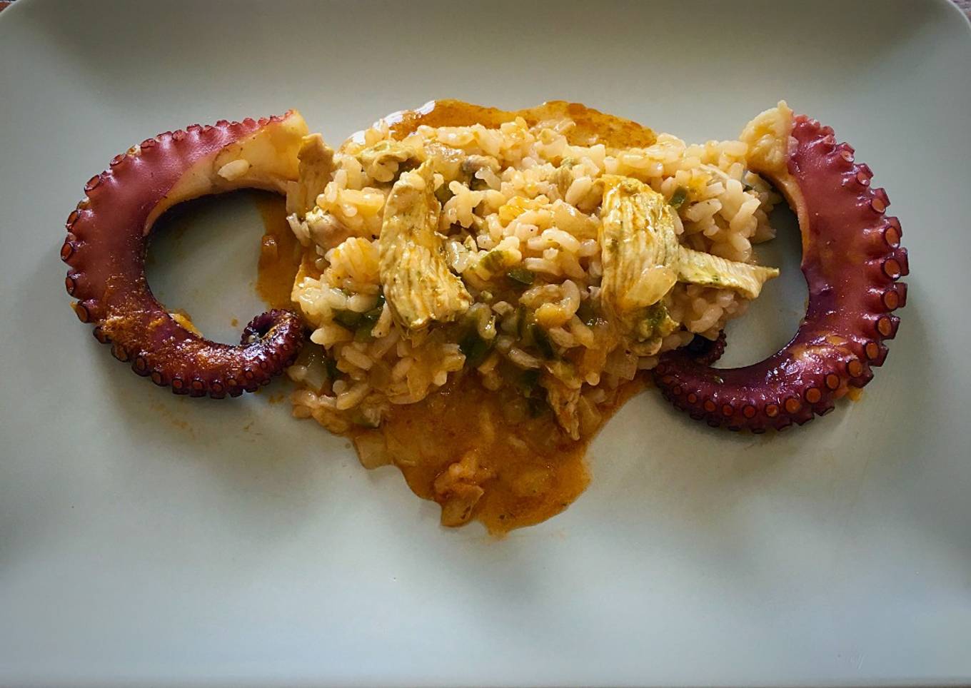 Arroz meloso con pulpo y pechugas de pollo con mojo verde