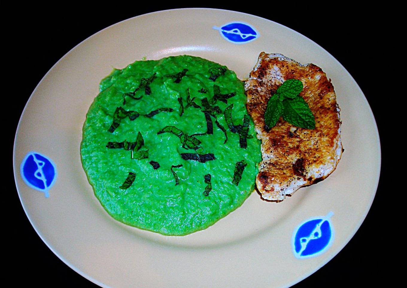 - Reparte el puré de guisantes en cuatros platos y los filetes de pechuga de pollo. Espolvorea un poco de menta por encima de puré. Aproveche!!!