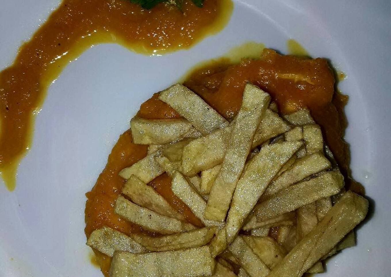 Filetes de pollo en salsa de zanahorias y cebolla acompañados de patatas fritas