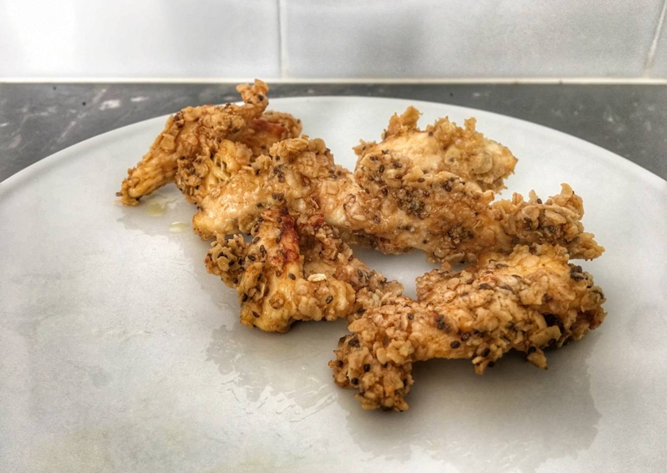 - Una vez esté bien impregnado el pollo con la mezcla, vamos poniendo los trozos de pollo en el otro bowl, con la avena y la chía mezcladas (con remover un poco la mezcla bastará), y cuando esté rebozados introducimos en la sartén con el aceite hirviendo.