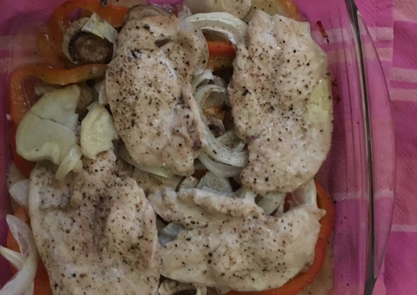 Filetes de pollo al horno con verdura y champiñones
