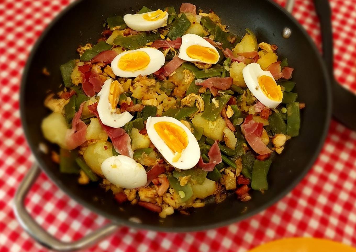 - Cuando estén doraditos añadimos el pollo cortado a trozos y removemos. Añadimos las judías y patatas reservadas.Damos unas vueltas y colocamos los huevos en láminas.