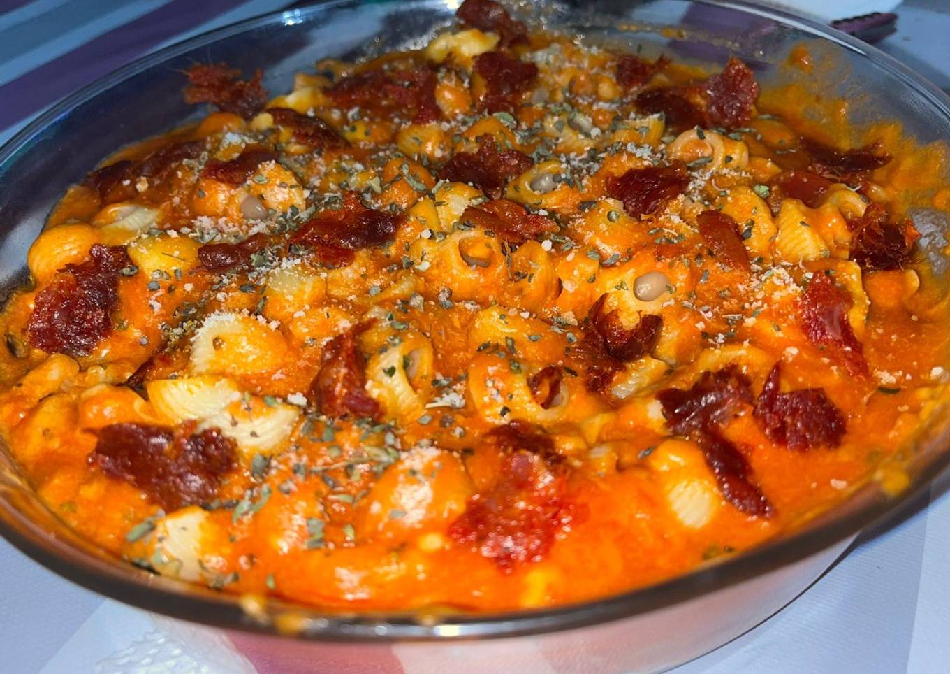 Macarrones con tomate frito, 2 quesos y chorizo picante