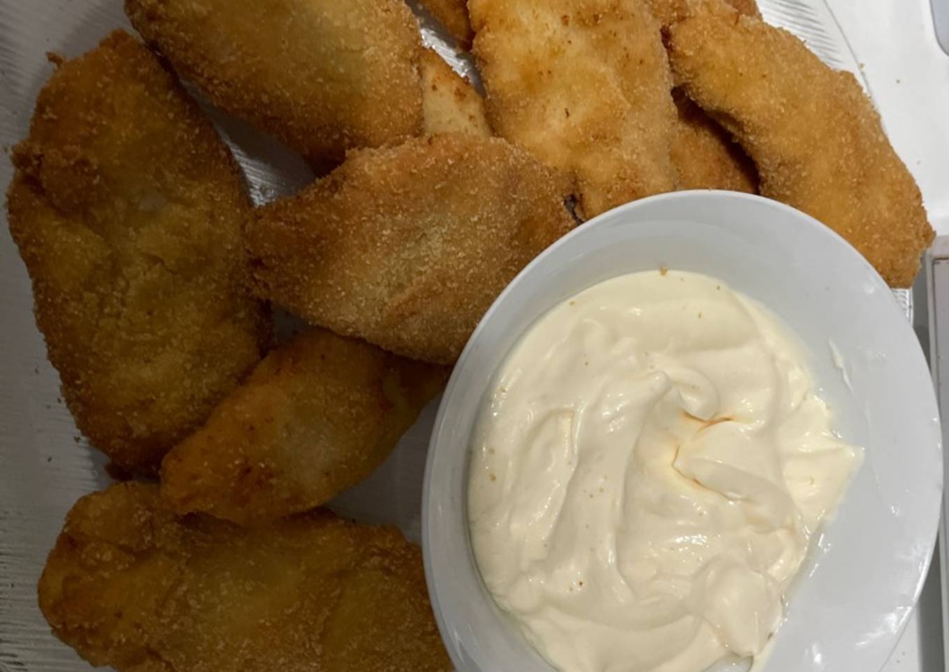 - Ponemos los nuggets en una servilleta de papel absorbente para retirar el aceite sobrante, hacemos un poco mahonesa para acompañar y plato listo. Espero que os guste.