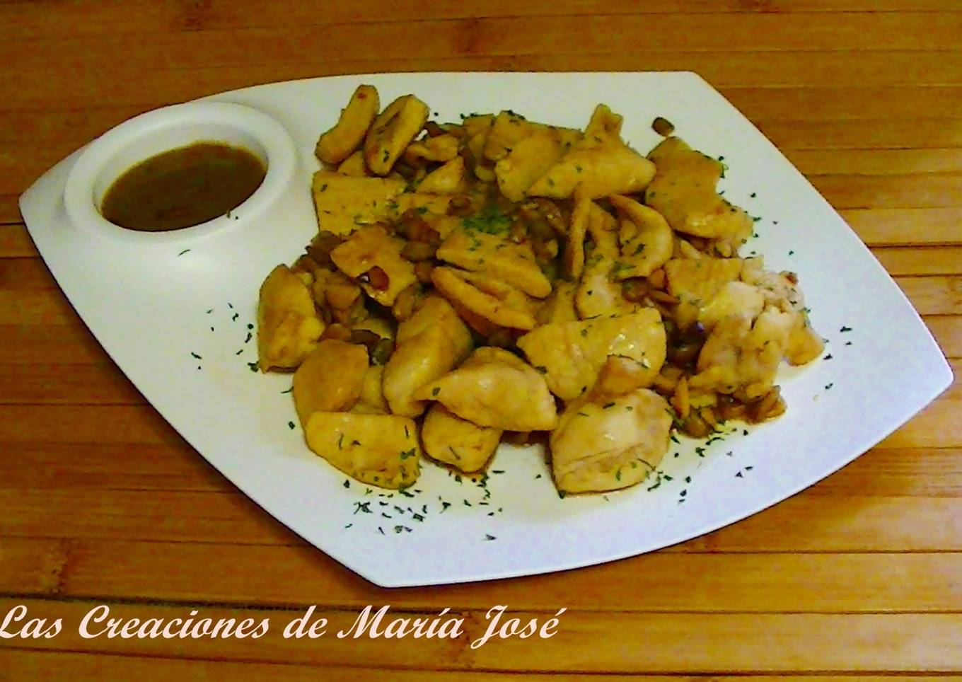 - Emplatar las pechugas, espolvorear perejil, echar la salsa en un cuenco para ir mojando las pechugas.