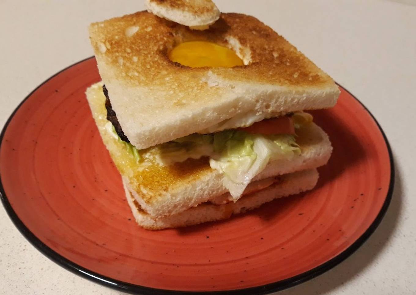 - Untamos con mahonesa otra rebanada, por las dos caras, la colocamos encima de la anterior y le ponemos la lechuga, dos rodajas de tomate, dos lonchas de bacón y el huevo.