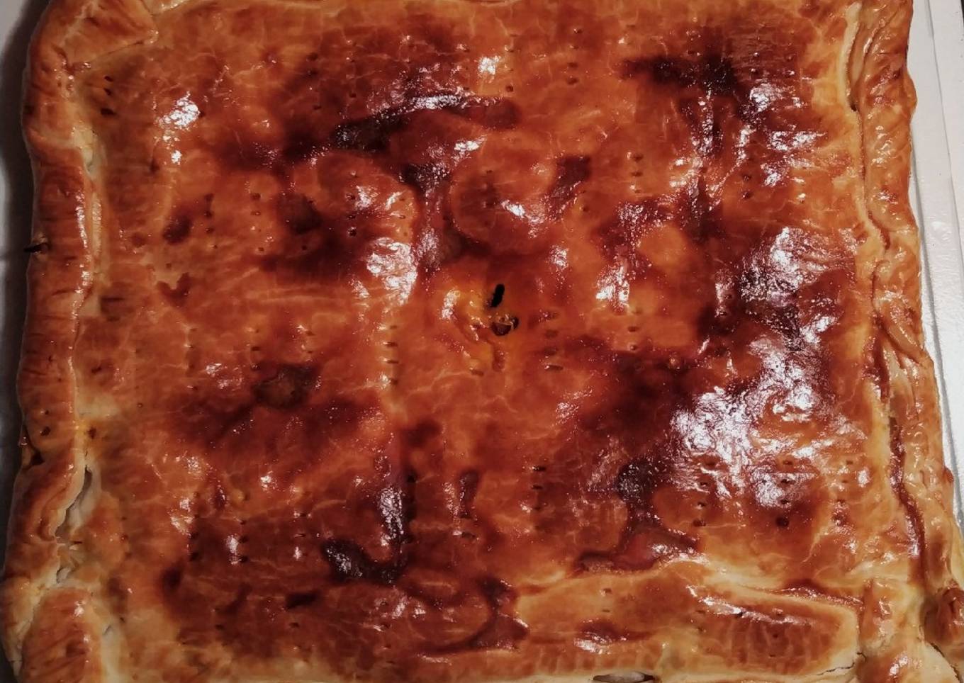 - En una bandeja para horno ponemos la masa de empanada, encima el relleno y encima de esto la otra nada y juntamos ambas masas, sellando los bordes